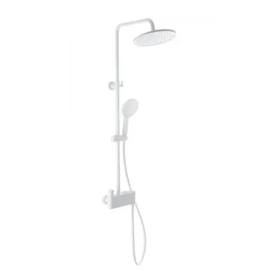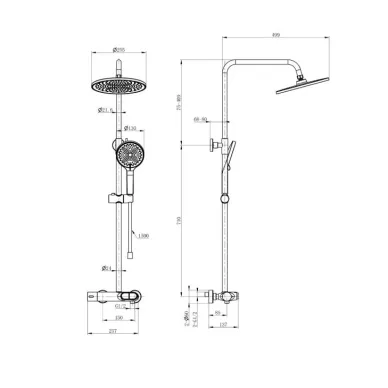 - Комплектация: смеситель, термостат, кронштейн, шланг, держатель, лейка, стойка, верхний душ