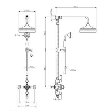 - Комплектация: смеситель, термостат, кронштейн, шланг, держатель, лейка, стойка, верхний душ